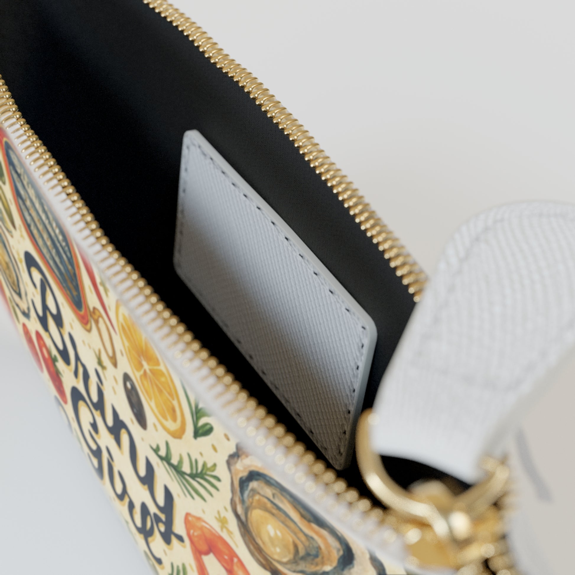 This cheeky mini wristlet channels the spirit of coastal cocktails, late-night snacking, and unapologetically salty moods. With custom hand-drawn art featuring olives, oysters, lemon wedges, and pickles, it’s made for the brine-curious babe who snacks in style.