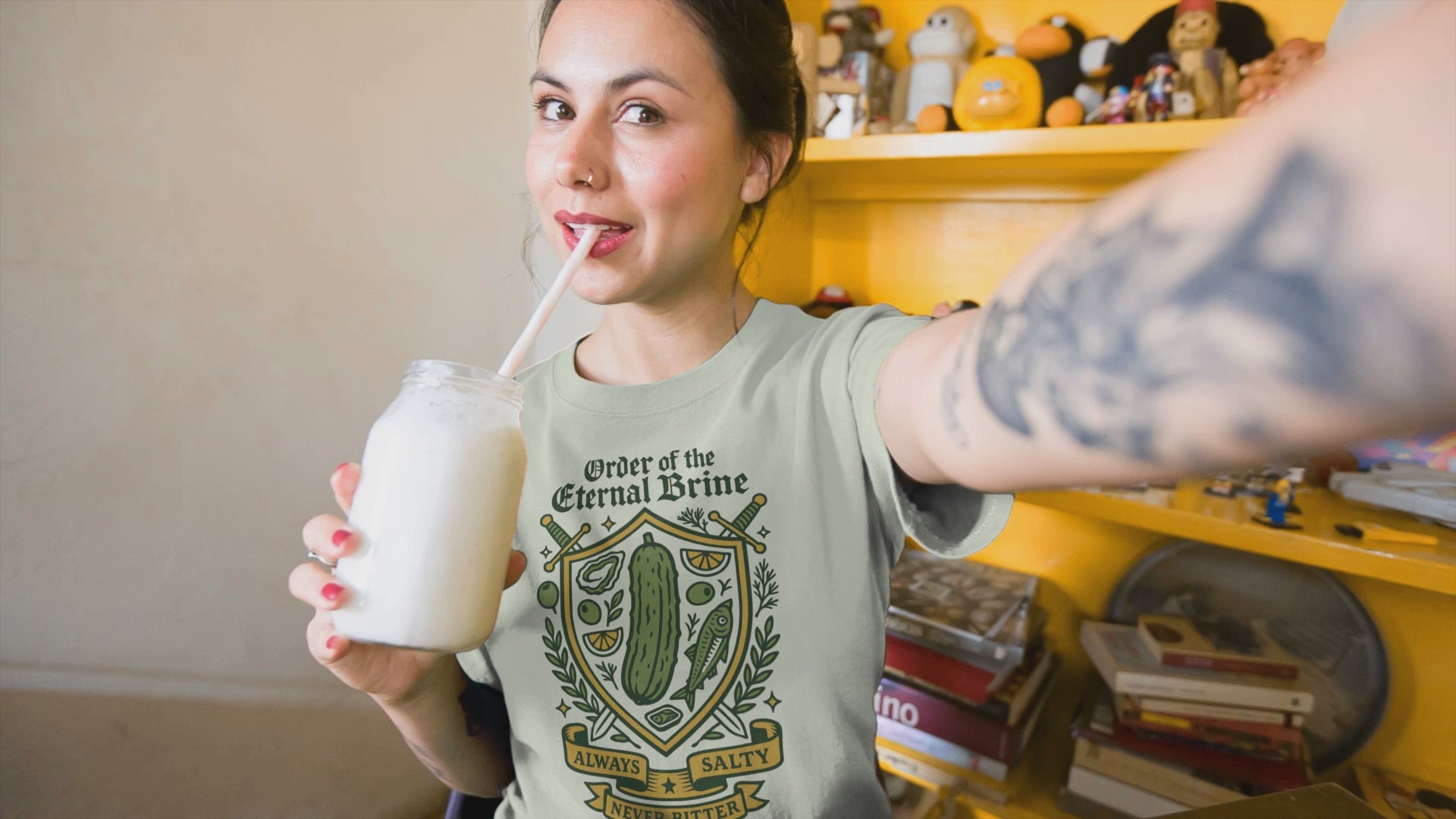 The vintage-style crest features a crowned pickle surrounded by olives, citrus, chili, dill, and a cocktail sword. Whether you are deep in picklecore, repping snackcore pride, or channeling ironic knightcore energy, this tee brings bold flavor and aesthetic drama.